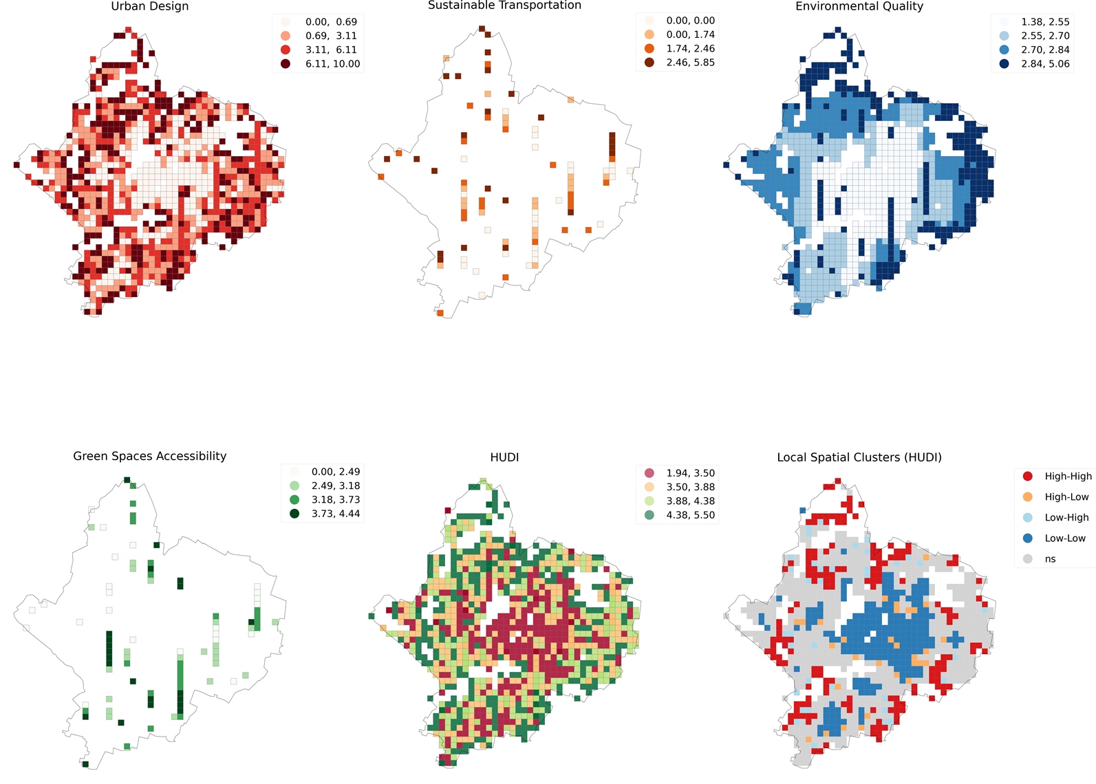 The first four maps illustrate the spatial distribution of indicator scores across four domains—urban design, sustainable transportation, environmental quality, and green space accessibility—within the defined municipal area, measured at a 250 m×250 m grid cell resolution. Darker colors represent better scores in each domain.