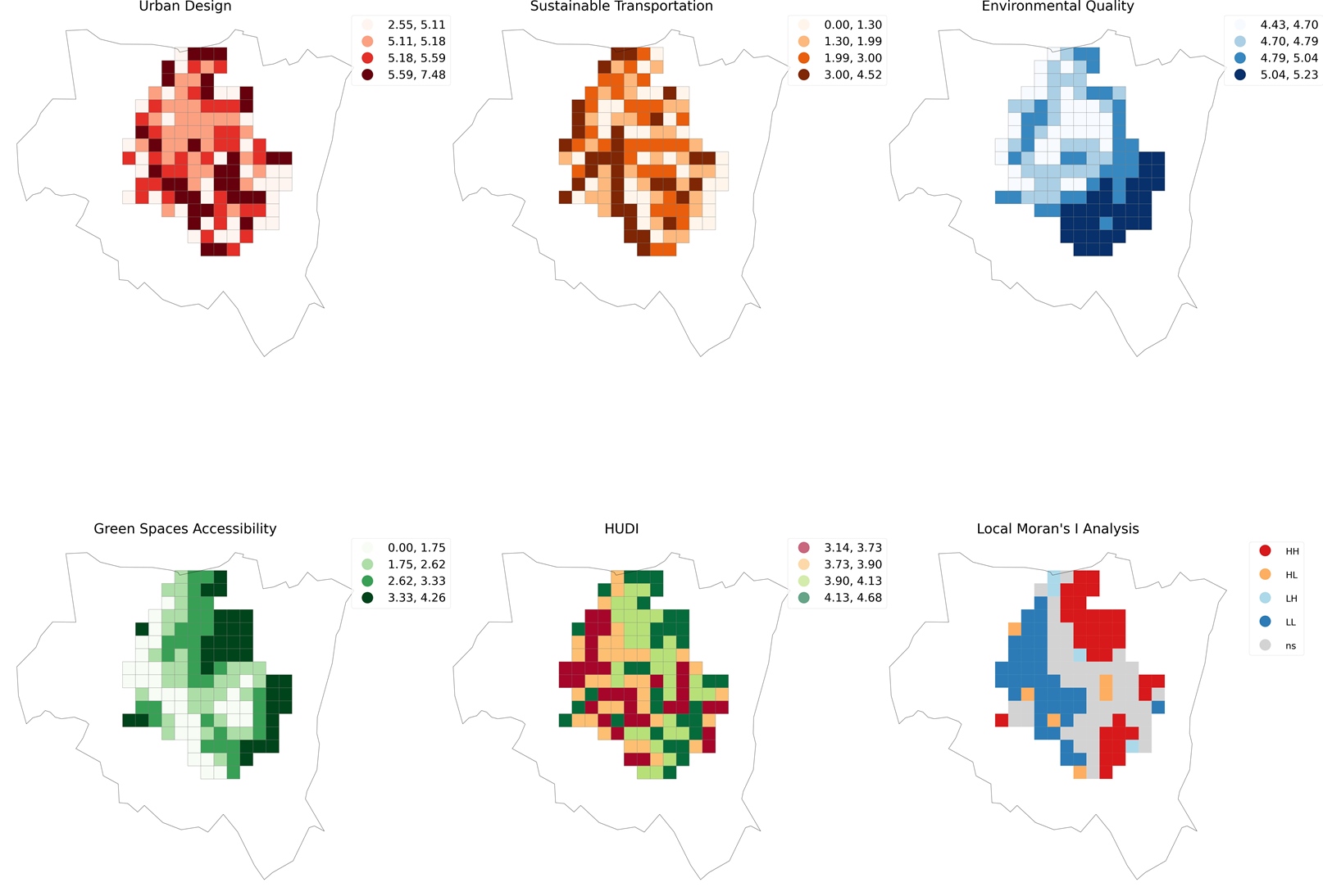 The first four maps illustrate the spatial distribution of indicator scores across four domains—urban design, sustainable transportation, environmental quality, and green space accessibility—within the defined municipal area, measured at a 250 m×250 m grid cell resolution. Darker colors represent better scores in each domain.
